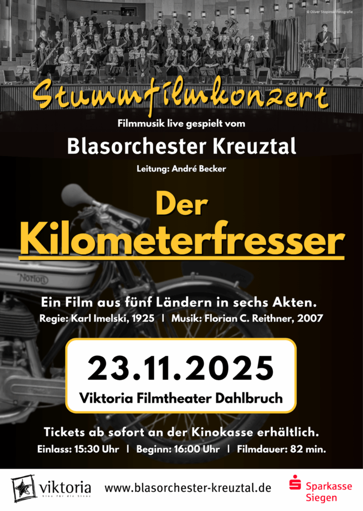Anstatt In 80 Tagen um die Welt heißt es bald in 15 Tagen durch Europa: Diese irrwitzige Abenteuerreise wird am 23. November 2025 um 16 Uhr im Viktoria-Kino in Dahlbruch vom Blasorchester Kreuztal unter der Leitung von André Becker live vertont.