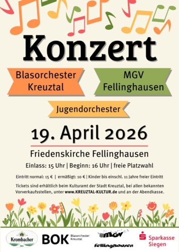 Das Blasorchester Kreuztal und der MGV „Sangeslust“ Fellinghausen laden am Sonntag, 19.04.2026 zu einem gemeinsamen Konzert in der Friedenskirche Fellinghausen ein!